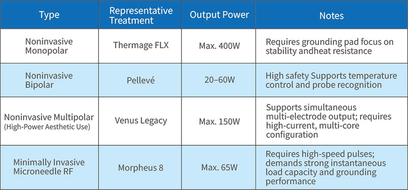 RF treatment systems typically require power delivery ranging from tens to hundreds of watts to generate stable and controllable thermal effects. Below are common power requirements:
