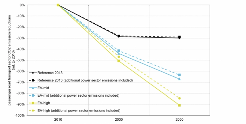 以電力取代傳統燃油可以大大減少溫室氣體排放。Ujet和SustainAbility的一份報告顯示,電動車僅需取代8%的燃油車即可於2050年減少80%的碳排放。